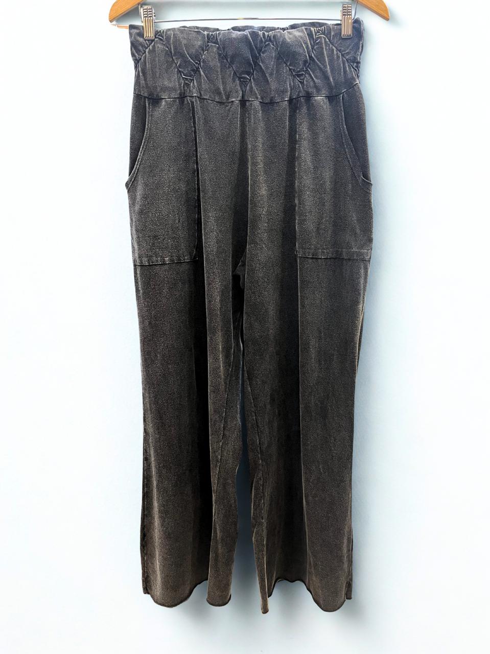 Calça com cós alto de elástico e bolso. Malha 100% algodão.
