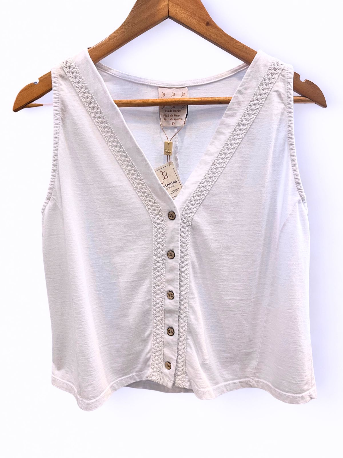 Regata com botões e detalhe em guipir. Malha 100% algodão.